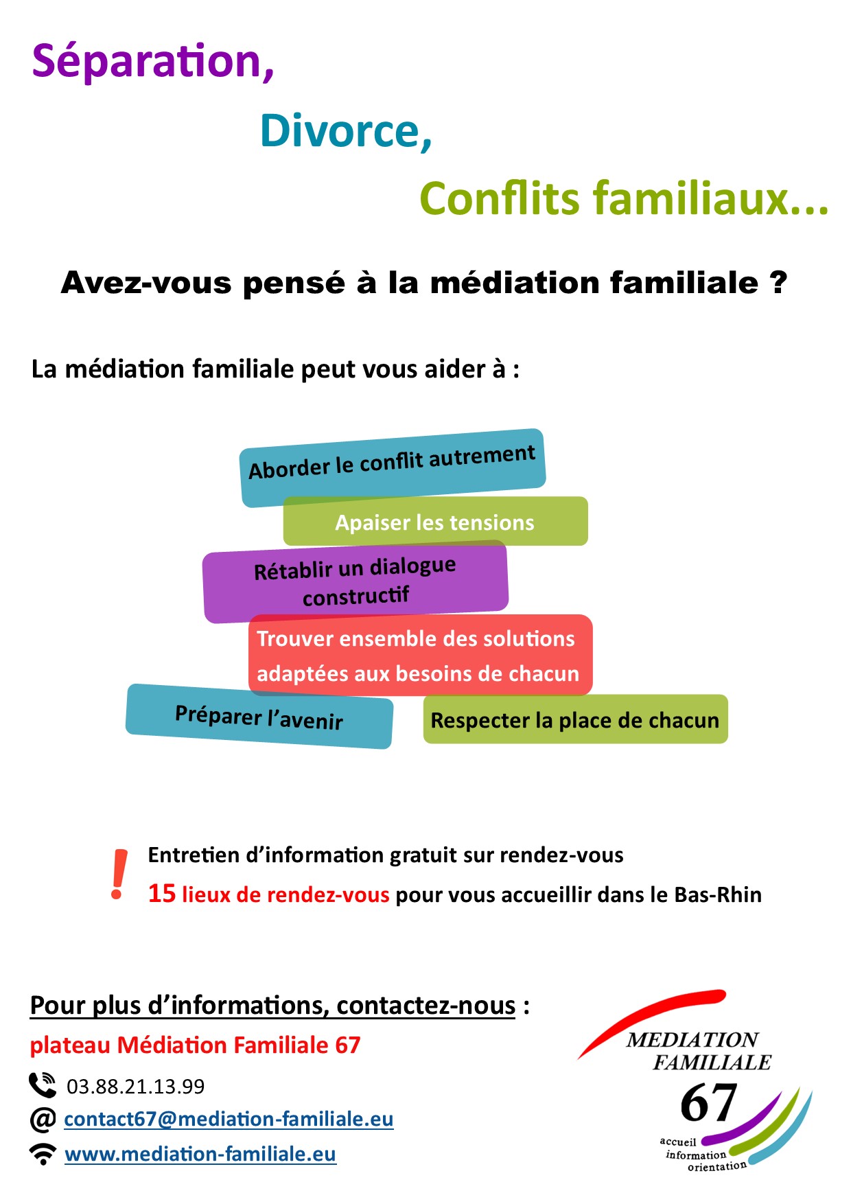 Le plateau Médiation Familiale 67, mutualisation des services de médiation familiale conventionnés du Bas-Rhin (à ce jour: RESCIF, L’Etage, CIDFF et l’AGF) propose un accueil centralisé du dispositif de médiation familiale, pour en faciliter l’accès et l’information aux familles et aux professionnels.